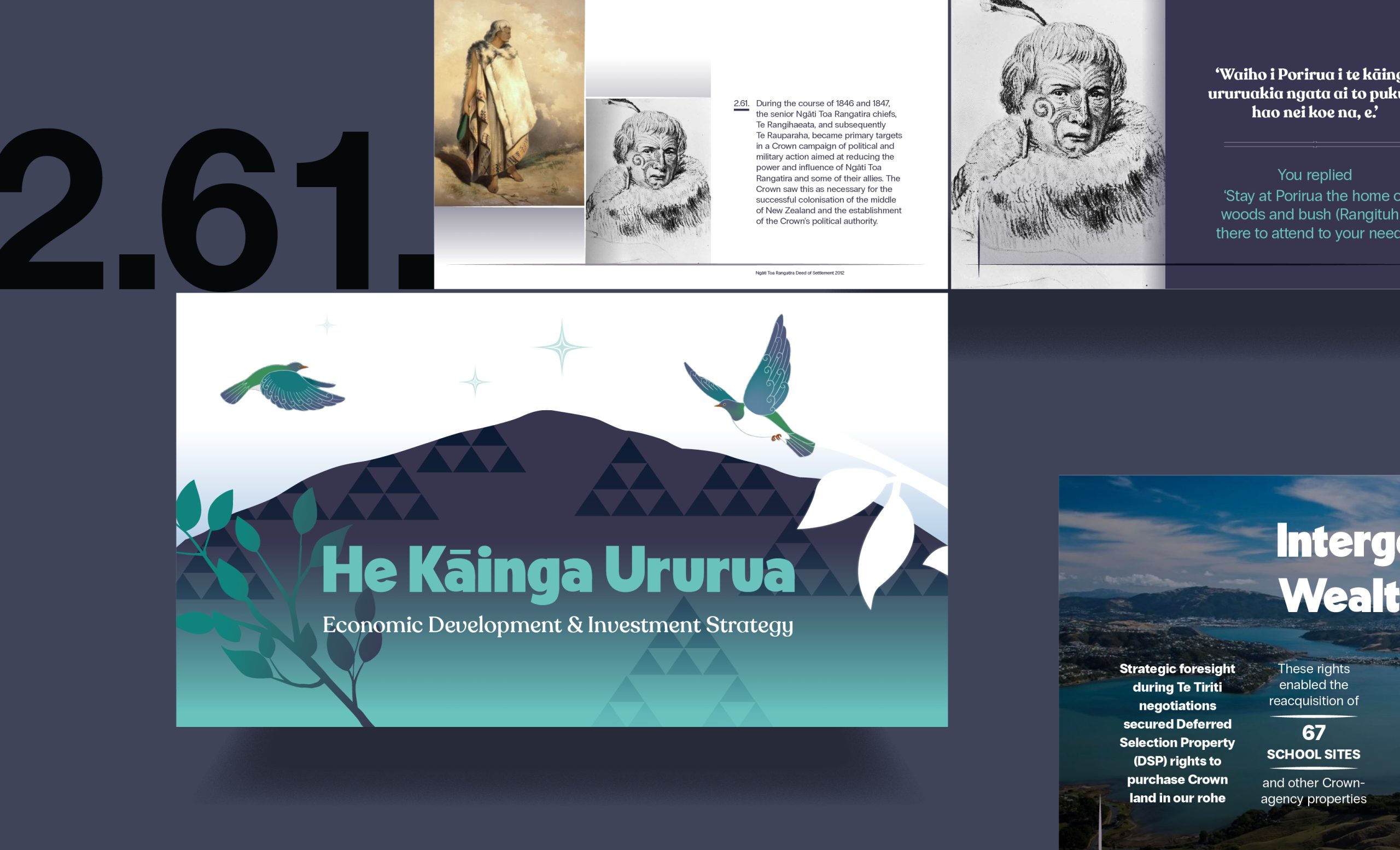 We were engaged to design and lay out He Kāinga Ururua, the Economic Development and Investment Strategy for Te Rūnanga o Toa Rangatira (on behalf of Ngāti Toa). The visual direction for the report was guided by a line from He Tangi nā Te Rangihaeata mō Te Rauparaha, providing a culturally grounded thematic foundation. “I asked ‘Are we to be divided into little pieces?’ You replied, ‘Stay at Porirua the home of woods and bush, there to attend to your needs’”.